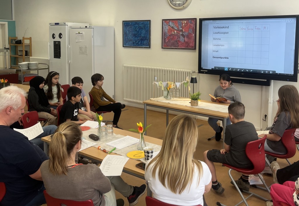 Jedes Kind hat einen eigenen Text mitgebracht und einer ausgewählten Zuhörerschar und einer 4-köpfigen Jury vorgetragen. Um einen fairen Vergleich zu ermöglichen, haben die Kinder der Jahrgänge 1 und 2 „gegeneinander“ gelesen – ebenso die Kinder der Jahrgänge 3 und 4.