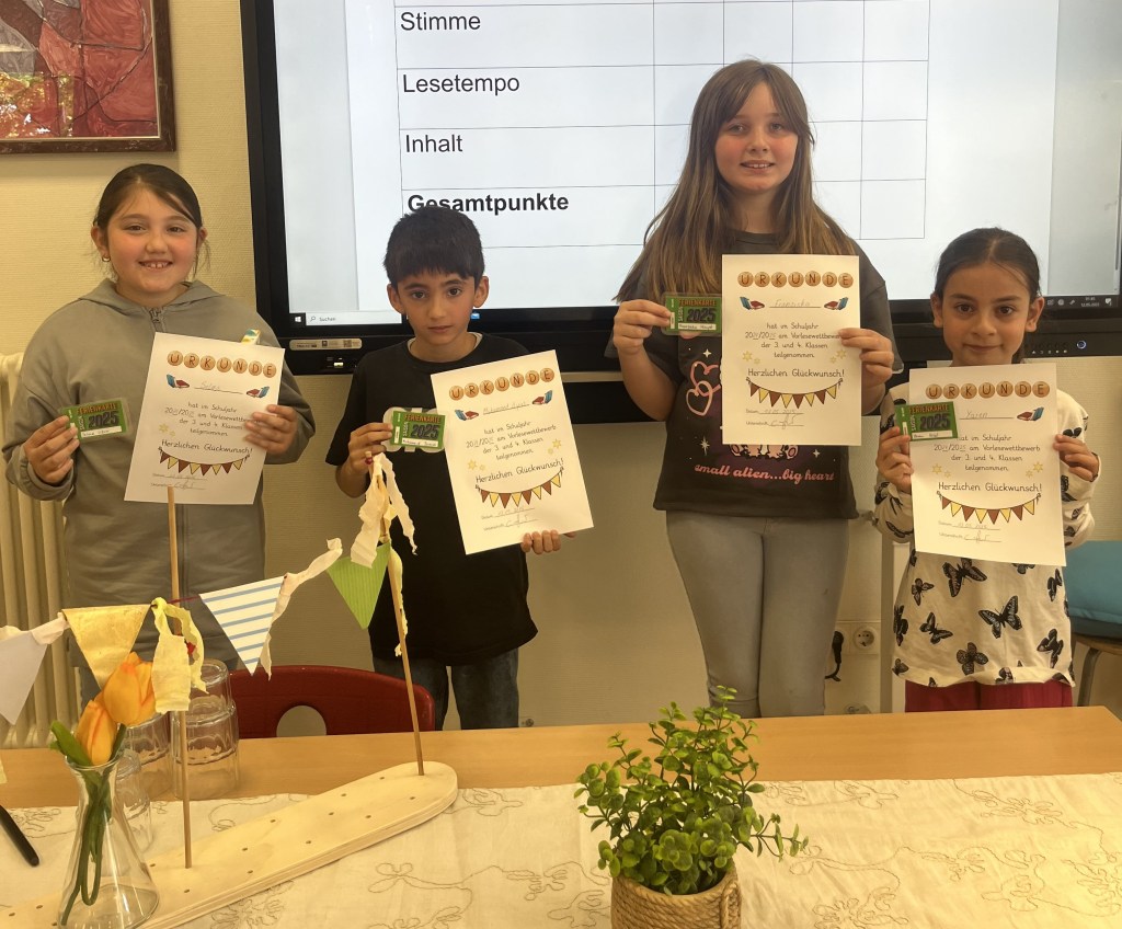 Und hier die Klassensieger der Klassen 3 und 4: Yren (3a), Muhammed Ilyas (3b), Selma (4a) und Franziska (4b)