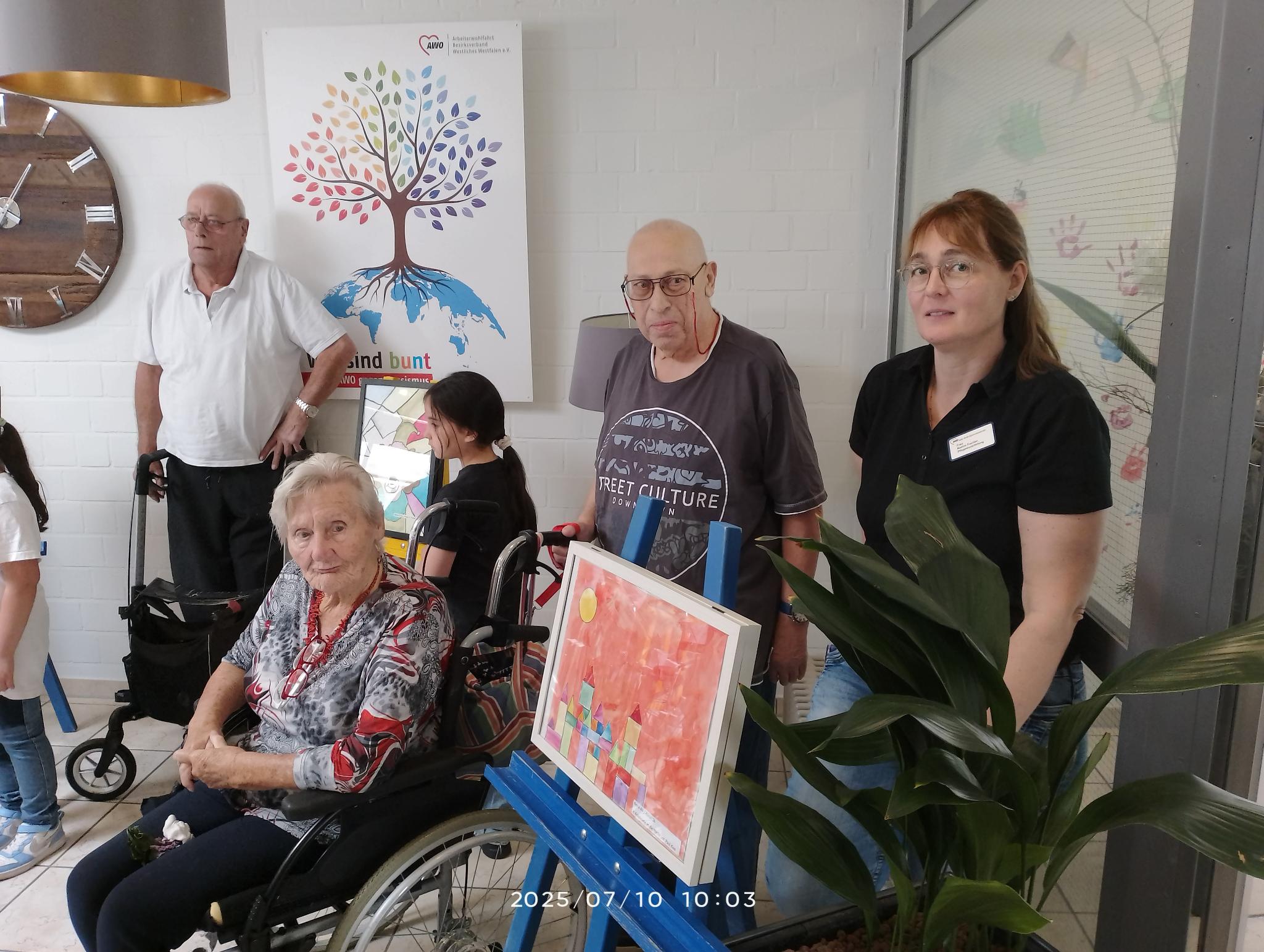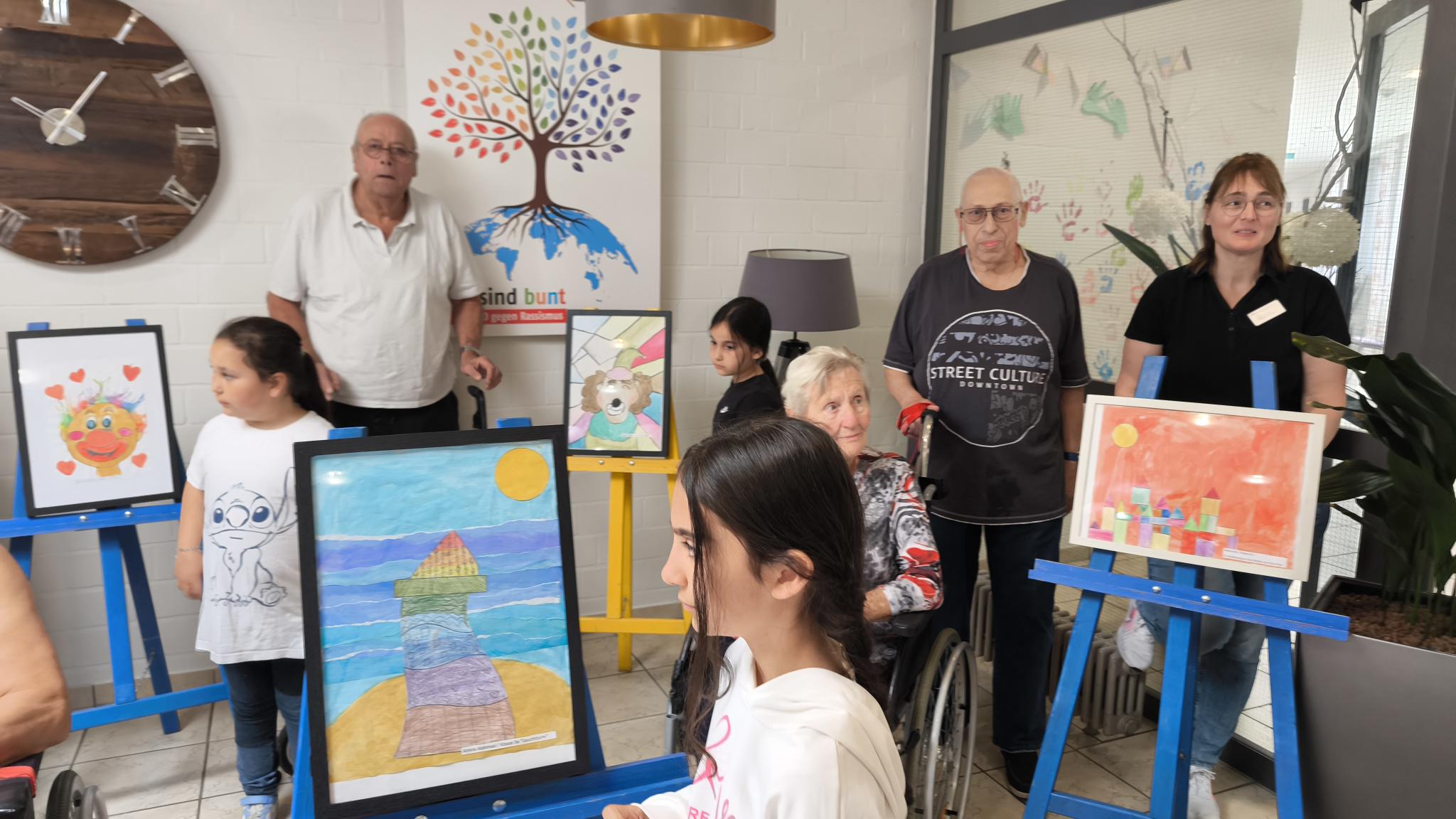 Heute wurde die erste Ausstellung mit einem kleinen Emfang im Eingangsbereich feierlich eröffnet. Auf Staffeleien und in schönen Rahmen kamen die ausgewählten Kunstwerke wunderbar zur Geltung. Nach einem gemeinsamen Foto der Künstlerinnen und Künstler zusammen mit Bewohnern des Hauses, gab es zur Feier des Tages sogar noch ein Gläschen Apfelschorle zum Anstoßen.