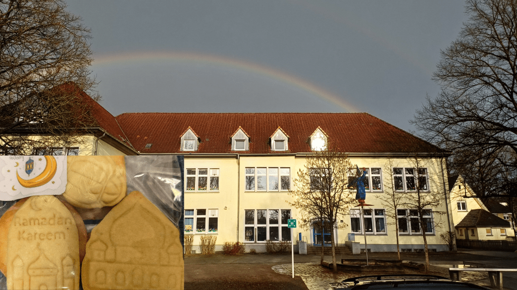 Oben im Titelbild kann man sehen, wie ein toller Regenbogen etwa 1 Stunde vor Beginn der Veranstaltung über der von der Sonne beschienenen Schule stand – was für ein schönes Zeichen vor so einer Veranstaltung, die der Verständigung von Christen und Muslimen dienen sollte.