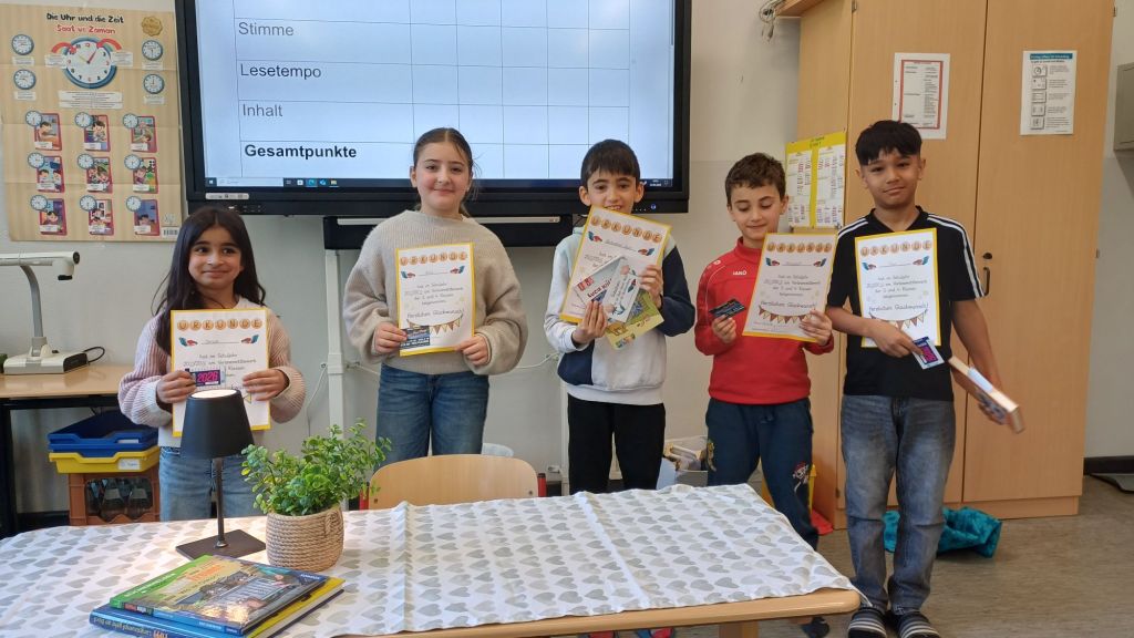 Am Ende wurden die besten Vorleserinnen und Vorleser feierlich ausgezeichnet. Doch auch alle anderen Kinder erhielten viel Applaus für ihre Leistungen und als besonderes Geschenk eine 10er-Karte für das Hülser Loemühlebad. Die beiden Gewinner aus den Jahrgangsstufen 1+2 und 3+4 dürfen sich zusätzlich noch ein Buch in der ortsansässigen Buchhandlung aussuchen.