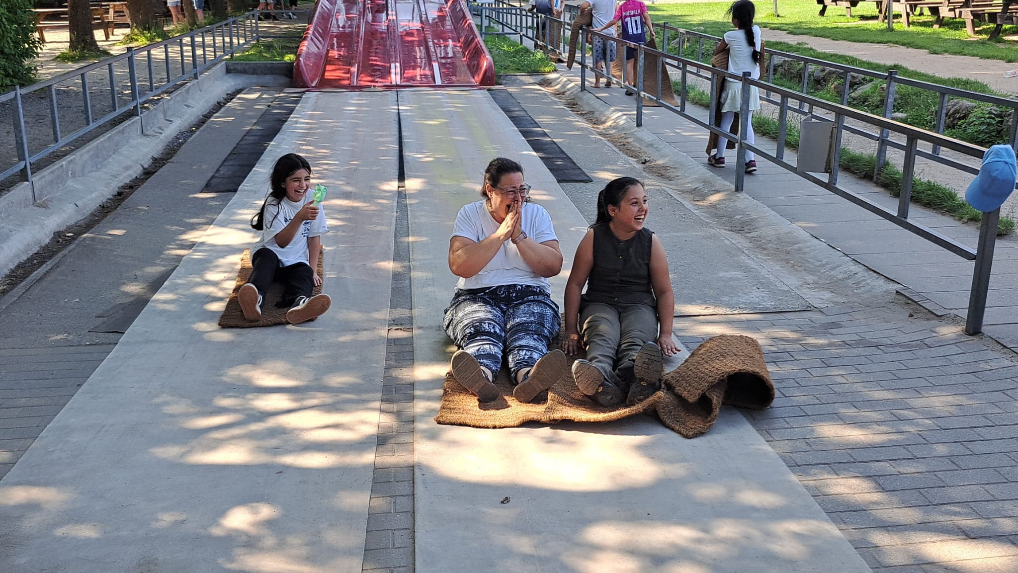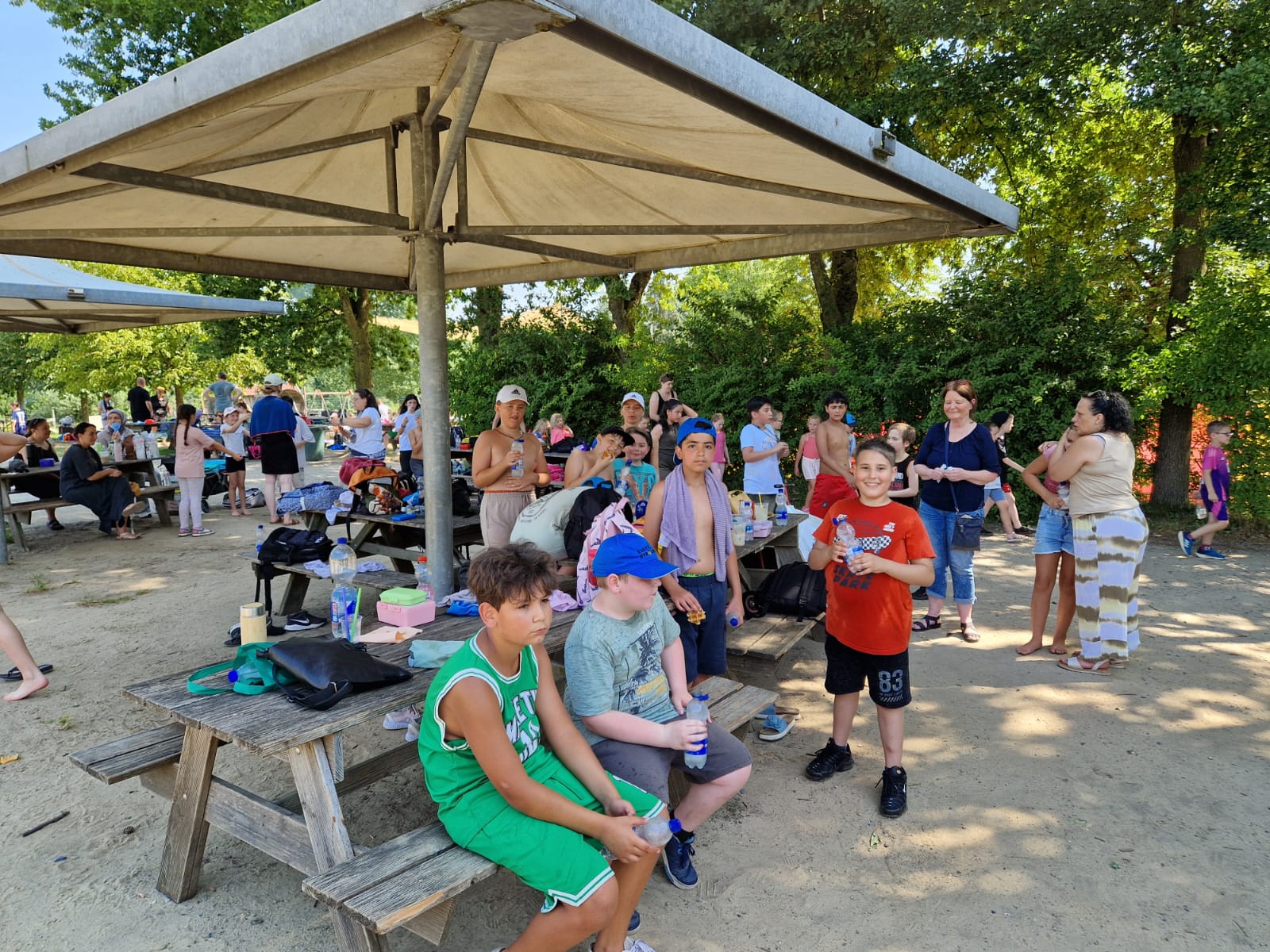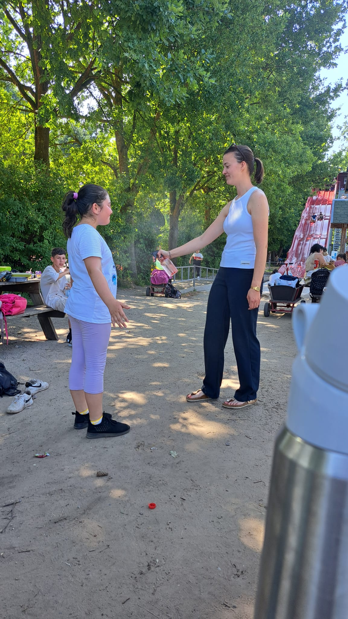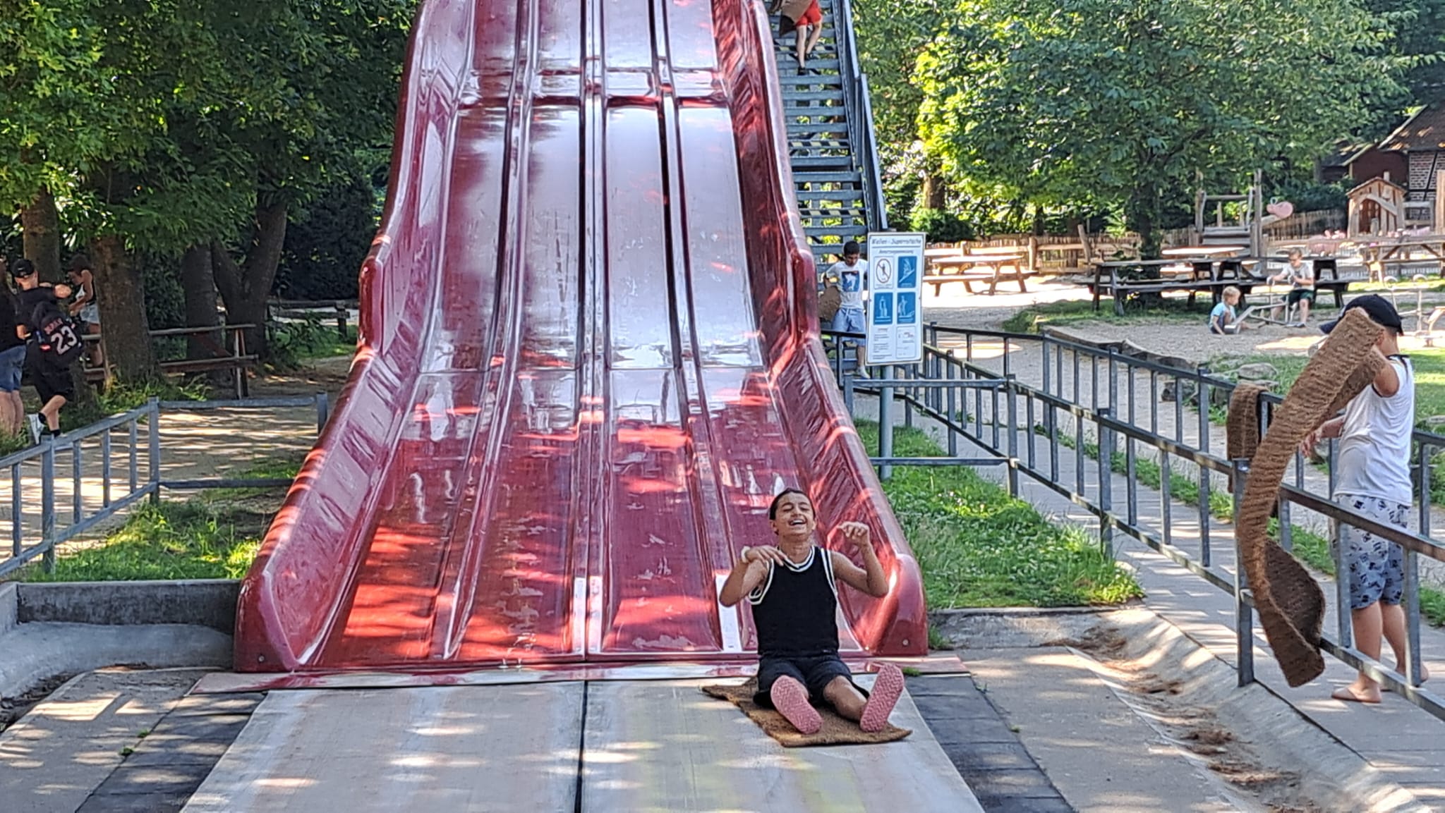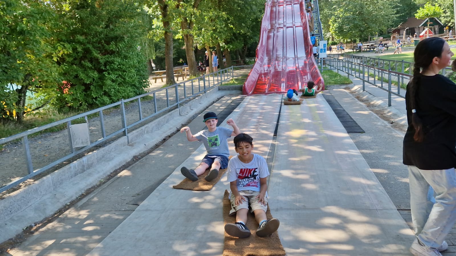 Auch der Ziegen-Streichelzoo, die Tier-Gehege und vor allem der riesige Spielplatz mit Hüpfkissen, Burgen, Klettergeräten, Rutschen und vielem mehr kamen sehr gut an. Zum Glück gab es einen Wasser-Spielplatz nebenan, an dem die Kinder und Lehrkräfte sich immer wieder erfrischen konnten.