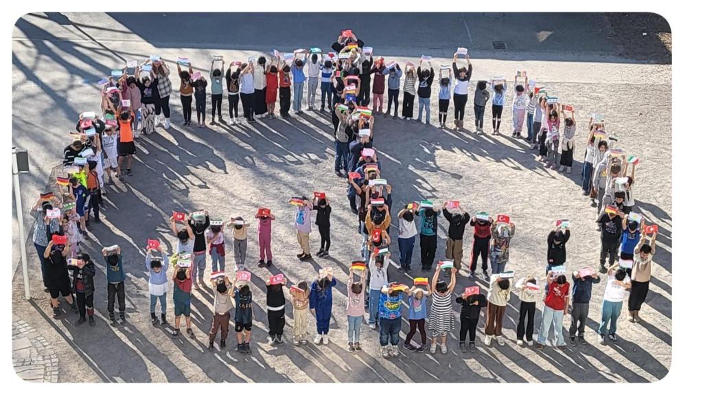 Auch die OGS hat sich anlässlich des Tages gegen Rassismus Gedanken gemacht. Das Motto der AWO in diesem Jahr lautete: „Herz statt Hetze“. Dazu haben die Kinder auf dem Hof ein Peace-Zeichen gebildet und mit Landesflaggen auf ihr Herkunftsland verwiesen – eine tolle Aktion!