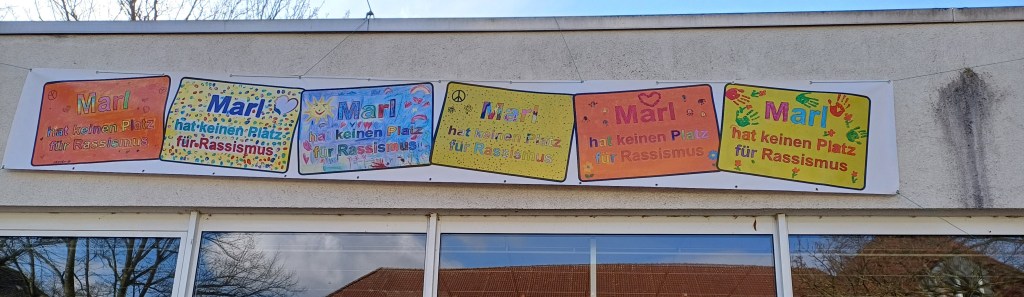 Außerdem gibt es jährlich Aktionen anlässlich der internationalen Woche gegen Rassismus. In diesem Jahr haben die Kinder unserer Schule Plakate mit der Aufschrift „Marl hat keinen Platz für Rassismus“ gestaltet, die wir dann mit Unterstützung des Programms „Demokratie fördern“ der Stadt Marl auf große Planen haben drucken lassen. Unsere Plakate hängen im März und April gut sichtbar am Gebäude und zeigen deutlich: