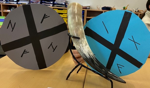 Außerdem lernten die Kinder die Wikingerschrift kennen und ihre Namen in Runen auf selbstgebastelte Wikingerschilder oder Holzscheiben zu schreiben.