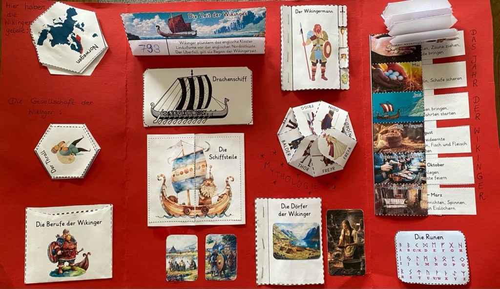 Aus letzteren wurden rustikale Wikingerketten. Besonders spannend fanden die Schülerinnen und Schüler die Göttergeschichten aus der nordischen Mythologie. Das Wissen über die Götter und alle anderen Lernergebnisse wurden in jeweils einem individuellen Lap-Book festgehalten, das jedes Kind selbst angefertigt und am Ende der Woche als Andenken mit nach Hause genommen hat.