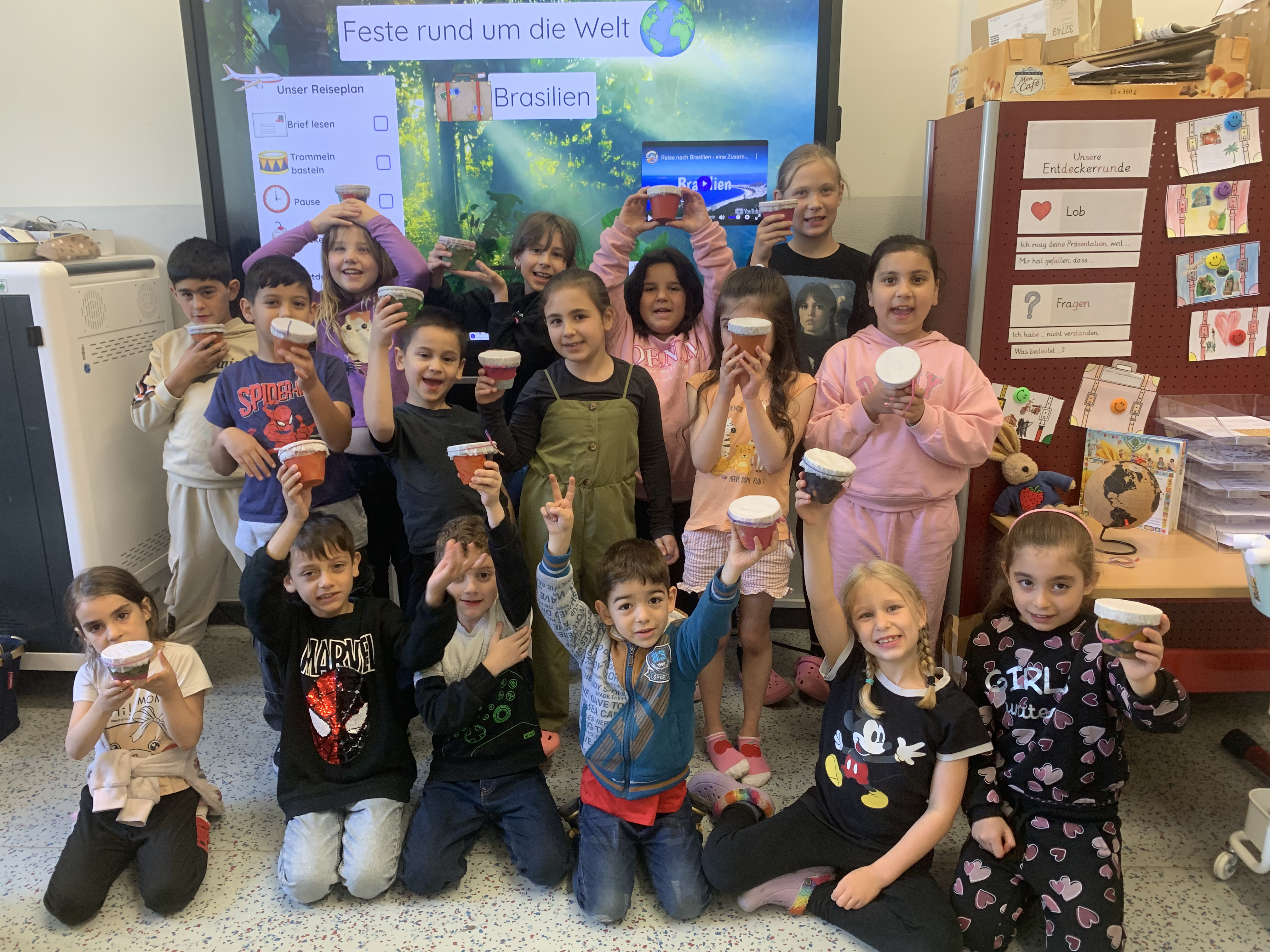 Am zweiten Tag reisten wir nach Brasilien. Mit bunten Trommeln und Rasseln, die wir selbst gebastelt haben, zogen wir durch das Klassenzimmer und feierten ein fröhliches Karnevalsfest – ganz wie in Rio! Die Musik und die Farben haben uns alle begeistert.