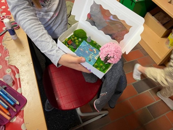 Zum Abschluss unserer Projektwoche hörten wir das japanische Märchen vom Pfirsichjungen – eine schöne Geschichte, die uns nochmal in eine ganz andere Welt mitgenommen hat.