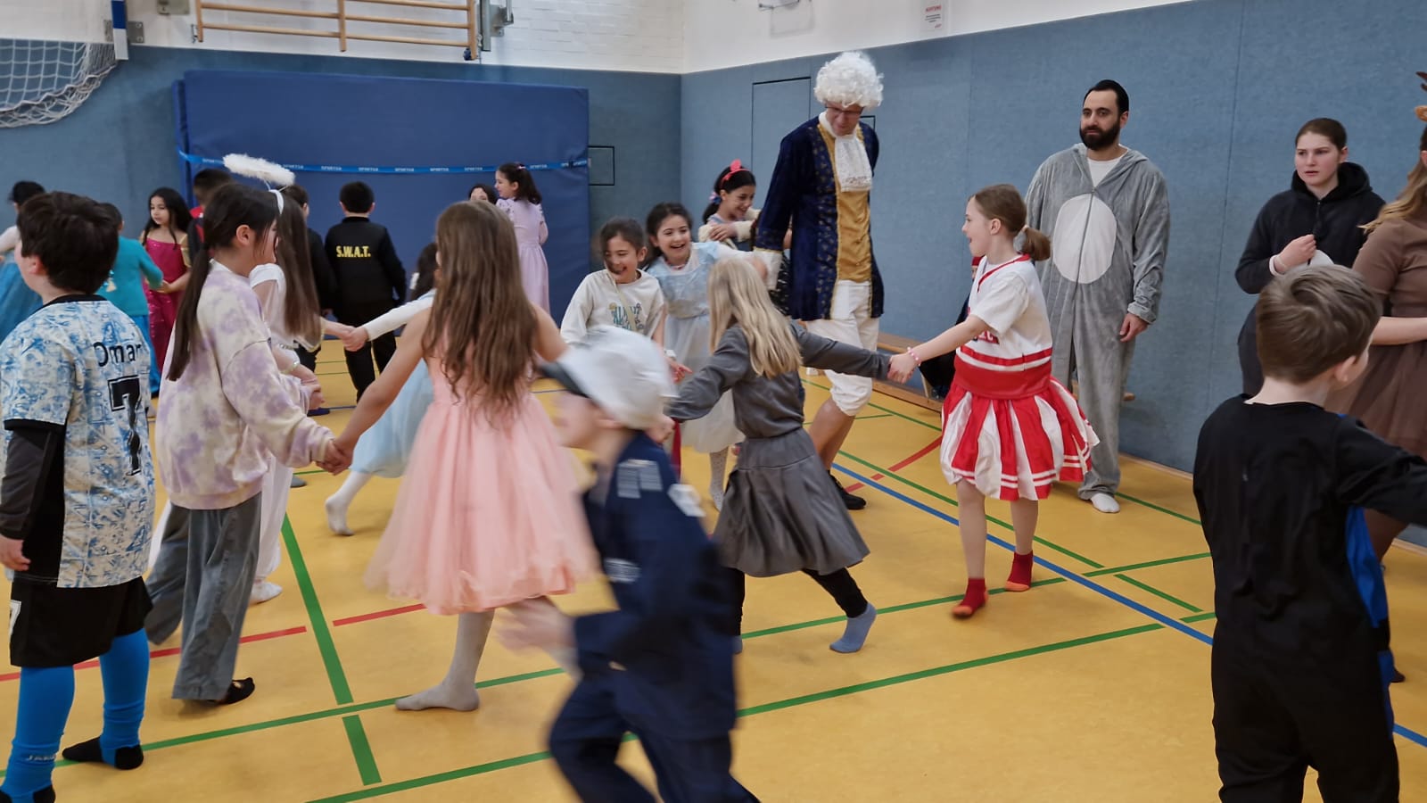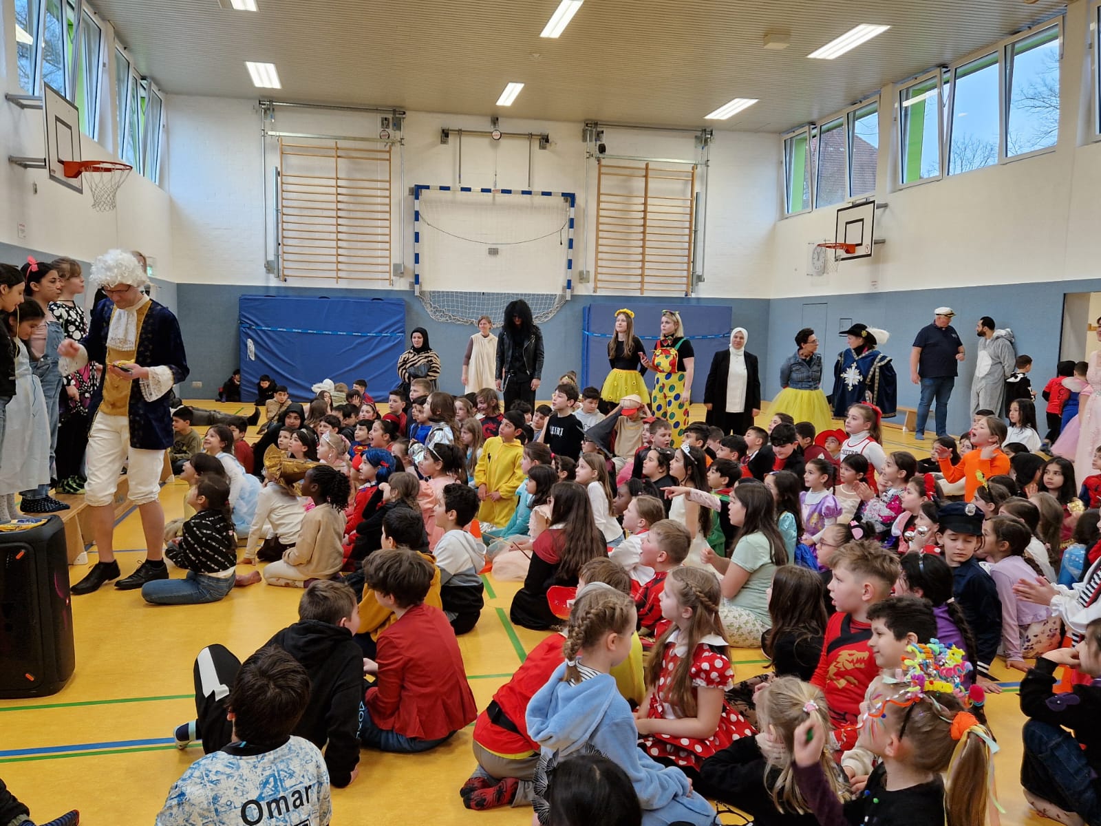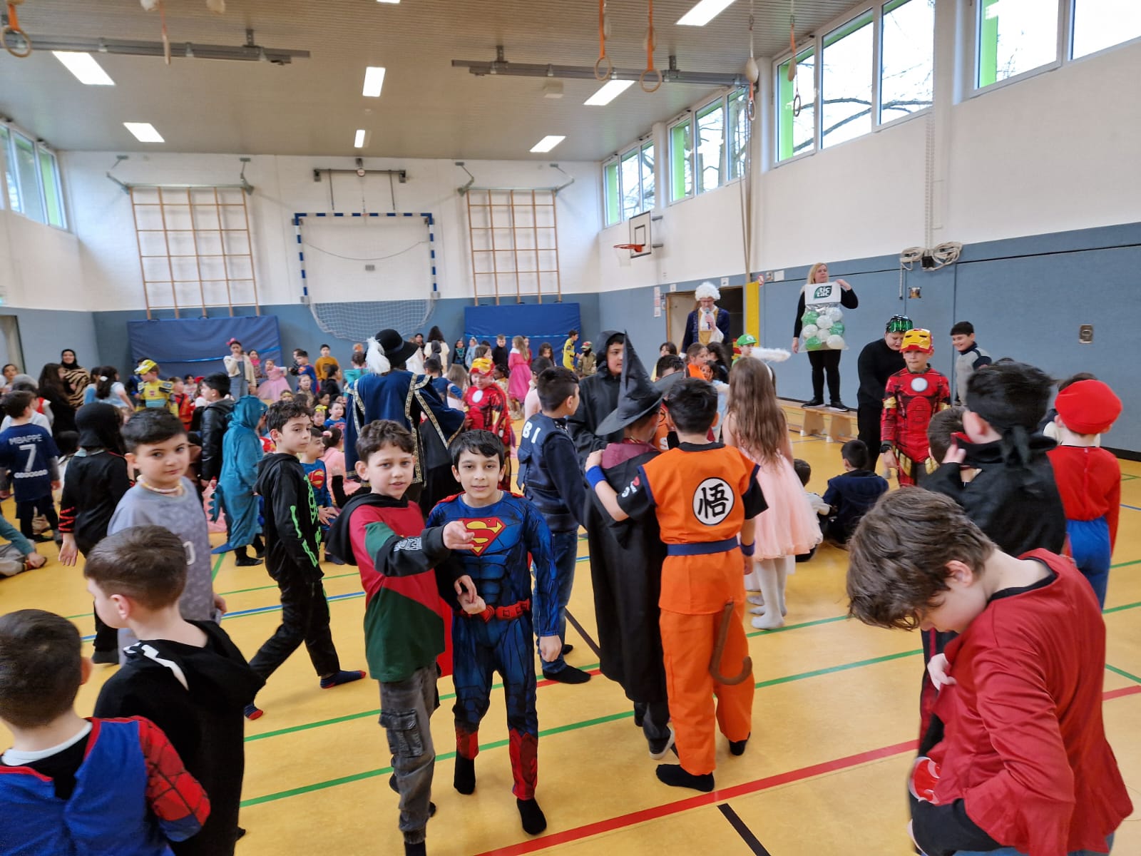 Am Freitag vor Rosenmontag steht bei uns alles im Zeichen des Karnevals. Zuerst feiern die Klassen zwei Stunden für sich im Klassenverband, im Anschluss feiern alle gemeinsam in der Sporthalle. Was für ein Spaß!