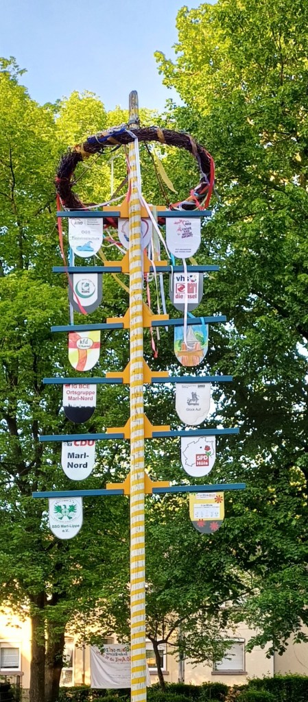 Vor vielen Jahren kam Pastor Müller von der St. Franziskusgemeinde auf die Idee, ein Stadtteilfest zu feiern und so war die Idee des Maibaumfestes geboren. Seitdem wird auf dem Gelände der Pestalozzischule immer am 30. April von den Gemeinden, Vereinen, Kitas, dem Moscheeverein, den Parteien vor Ort und der Pestalozzischule zusammen mit der OGS ein buntes Familienfest gefeiert.