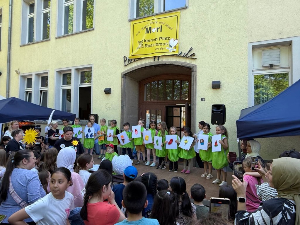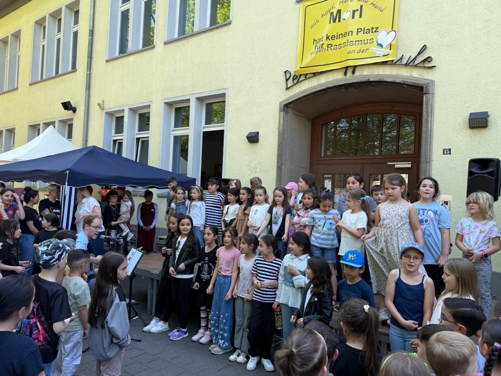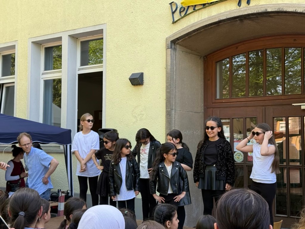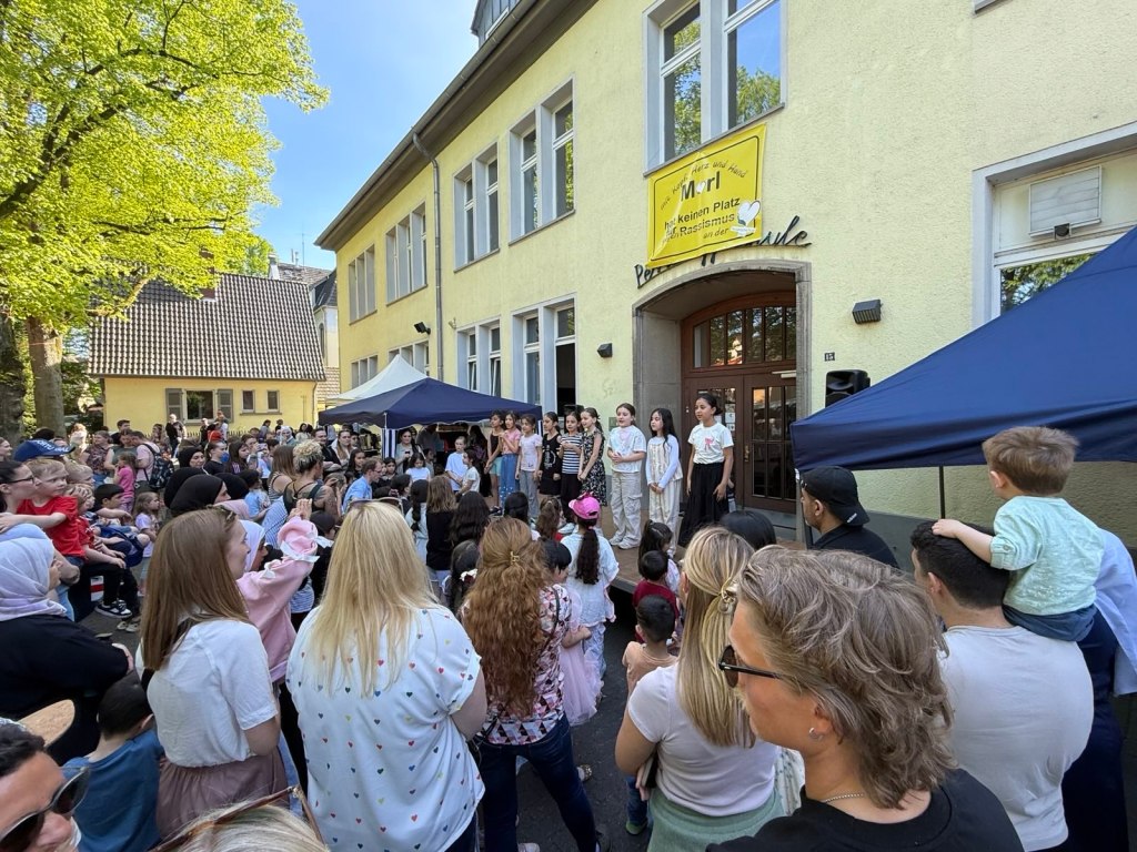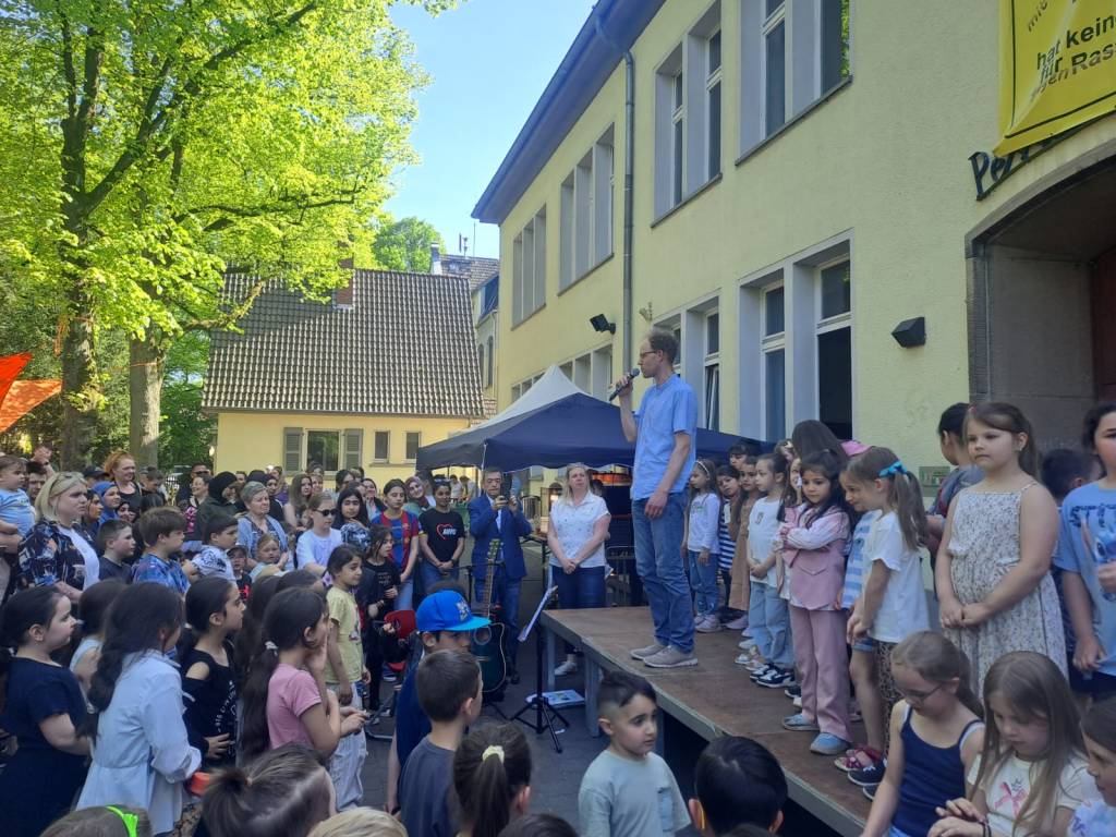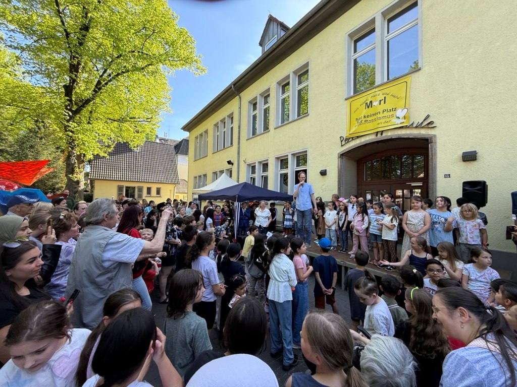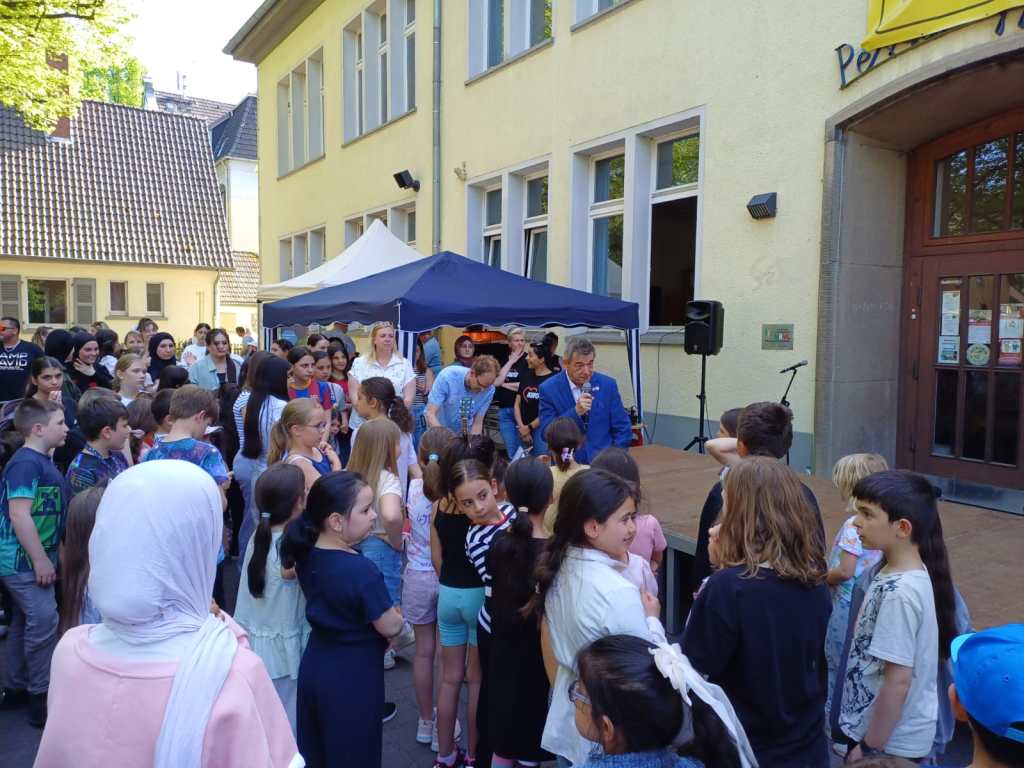 Los ging es mit einem bunten musikalischen Programm. „Wir heißen jeden hier willkommen“ tönte es zur Begrüßung aus den Kehlen der Pestalozzischülerinnen und -schüler. Kinder der AWO-Kita haben dann im Anschluss das Stück „Die kleine Raupe Nimmersatt“ aufgeführt und die Kinder der Klassen 1a und 1b haben das Lied von den ersten Blumen des Frühlings vorgetragen. Einige Kinder der OGS haben mit einem tollen Tanz die Zuschauer begeistert und gezeigt, was in ihnen steckt. Sogar der Bürgermeister war vor Ort und hat mitgefeiert.